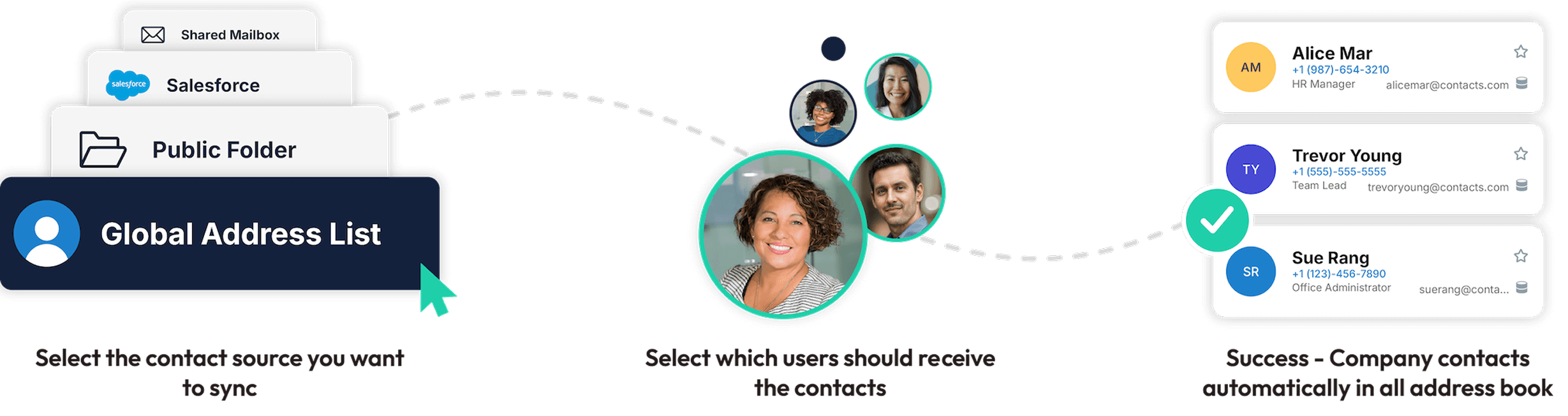 The process to sync Exchange contacts with Android is fully automated and runs on your preferred schedule. CiraSync intelligently processes GAL data, mapping key fields like name, email, phone number, and job title to the corresponding fields on users’ smartphones. It also handles common data challenges like duplicates and conflicts automatically, ensuring only the most accurate, up-to-date information is synced when you sync the Exchange Global Address List to Android.