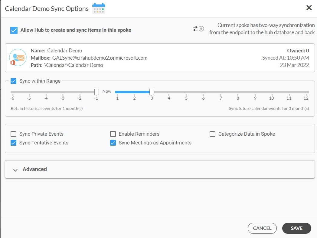 12. Next you can set up sync options and advanced settings for items in the spoke. Important: learn more about Calendar Sync Options here.
