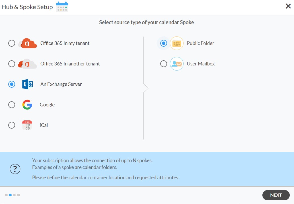 5. On the CiraHub dashboard, add a Mailbox Calendar using the +Spoke button. Click on “Exchange Server” as your source type for your calendar spoke and select Public Folder.