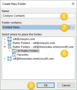 - Name the new folder. In this example, the new folder is called CiraSync Contacts.